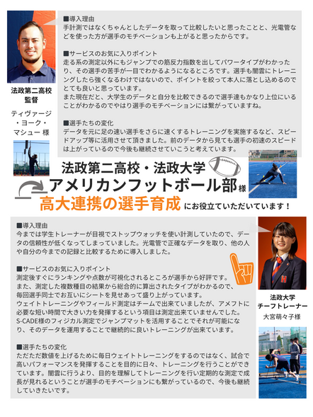バスケ、サッカー、アメフト、ラクロス、野球が対象です。場合によっては他競技も測定可能となっておりますので お気軽にご相談ください。